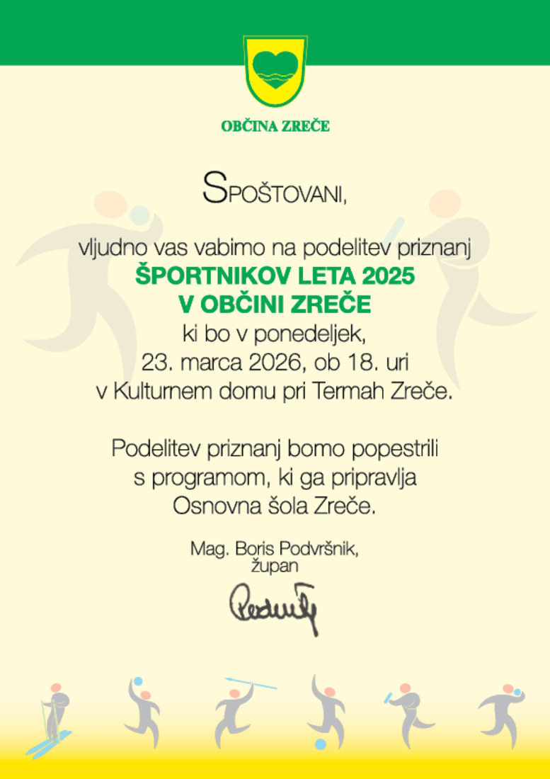 Vljudno vabljeni na podelitev priznanj ŠPORTNIKOV LETA 2025 V OBČINI ZREČE, ki bo v ponedeljek, 23.3.2026 ob 18. uri, v Kulturnem domu pri Termah Zreče.