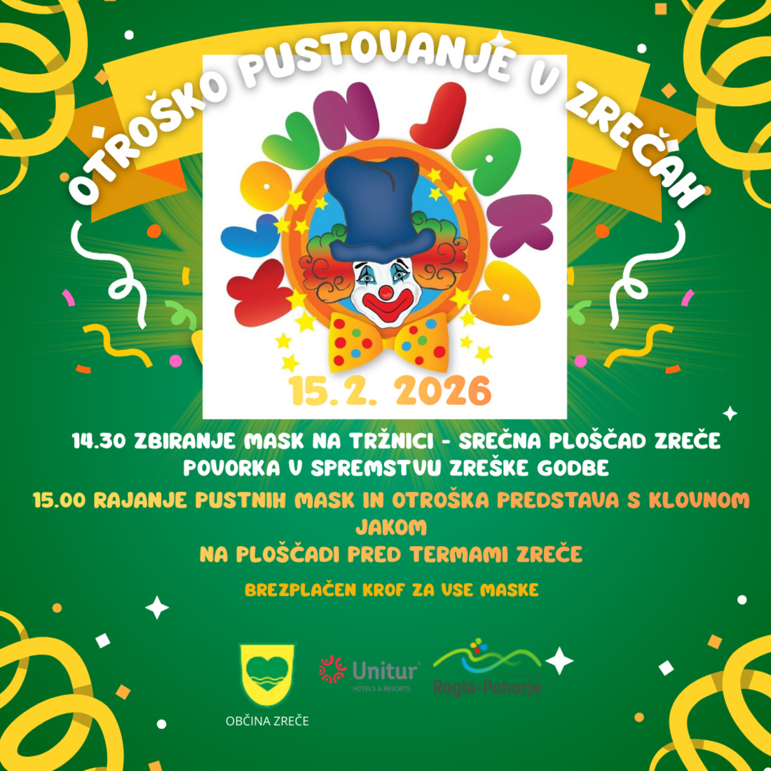 ob 15.00 pa veselo rajanje in otroška predstava s klovnom Jakom na ploščadi pred Termami Zreče – vsako masko čaka tudi brezplačen krof.