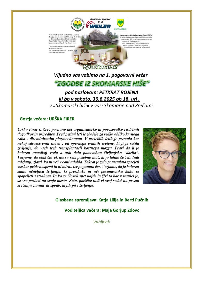 Vljudno vabljeni na 1. pogovorni večer z gostjo večera Urško firer, ki bo v soboto, 30.8.2025 ob 18. uri v Skomarski hiši